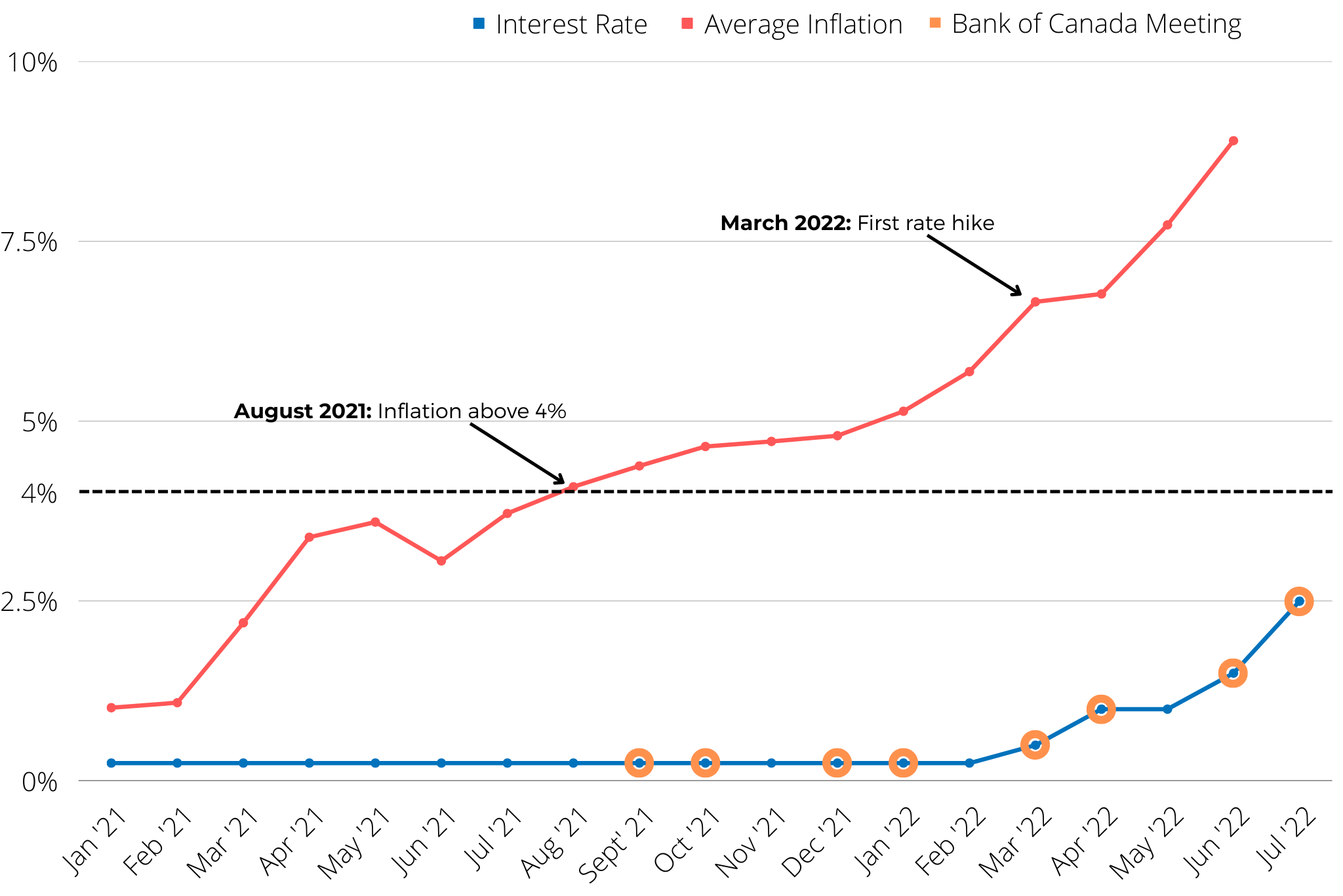 I’ve confirmed this speaking to some of my peers in the banking and mortgage industry. Because the Bank of Canada was so slow to react, rate hikes are likely to last until at least early 2023 with three more opportunities for them to be raised between now and the end of the year.