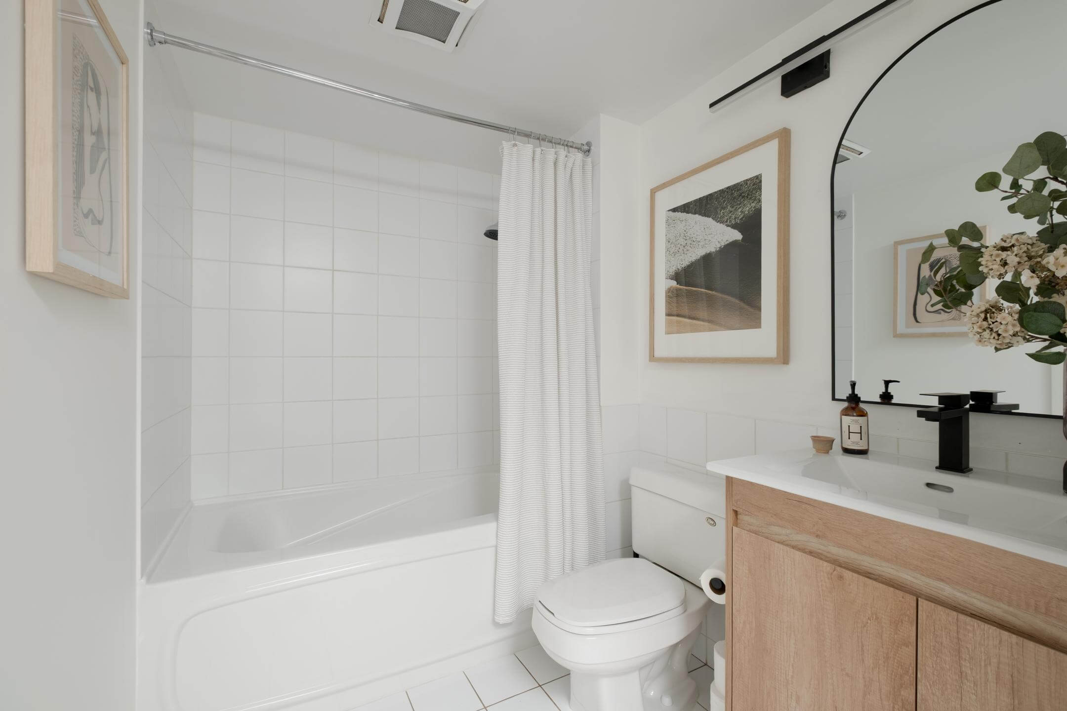 The bedroom is bright and spacious with a large window, walk-in closet, and room for a king-sized bed, side tables, and a dresser. The upgraded 5-piece bathroom includes both a tub and separate stand-up shower — a rare blend of space, storage, and function in a downtown one-bedroom.